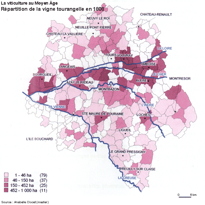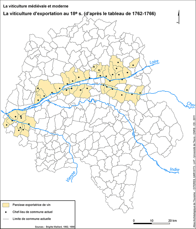 Si des vignes sont présentes dans la quasi-totalité des paroisses de Touraine, seules quelques unes connaissent une viticulture à vocation commerciale au 18e siècle. Cette activité d'exportation se concentre sur la rive droite de la Loire, sur la rive gauche du Cher et dans le Chinonais (Véron).