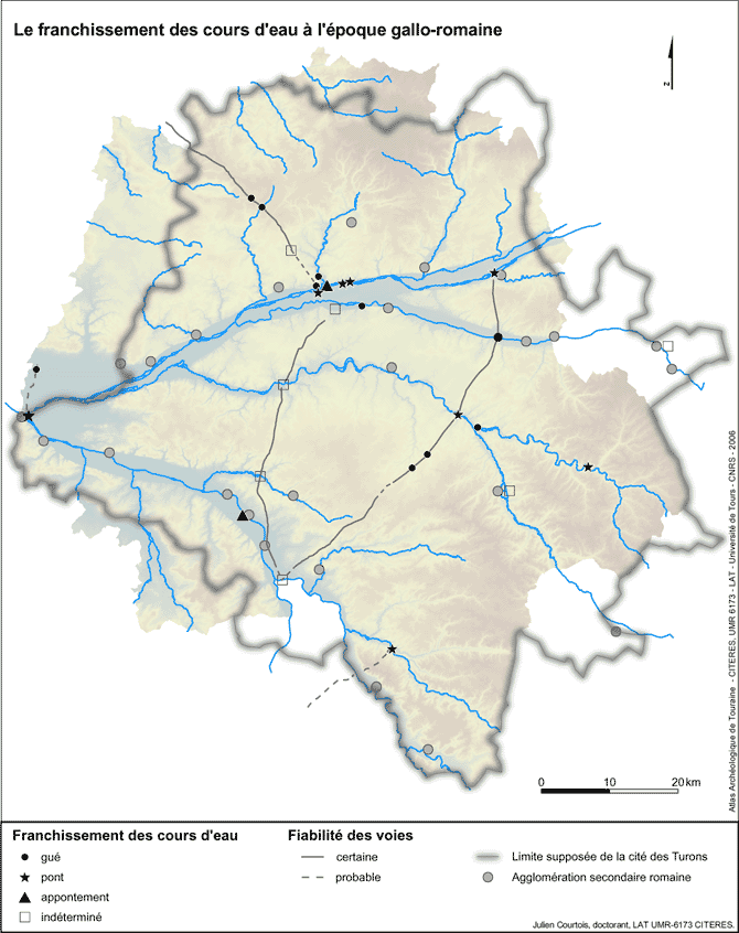 Seuls cinq ponts peuvent être datés avec assurance de l'époque romaine, à Candes-St-Martin, Fondettes, Tours (pont dit de l'île St-Jacques et pont dit de l'île Aucard), et au Grand Pressigny. Cette carte de répartition reflète l'état actuel de la recherche, fondé sur nos connaissances de la voirie antique et des agglomérations secondaires. L'évolution de ces franchissements de rivière reste très mal connue, faute de bases chronologiques sérieuses.