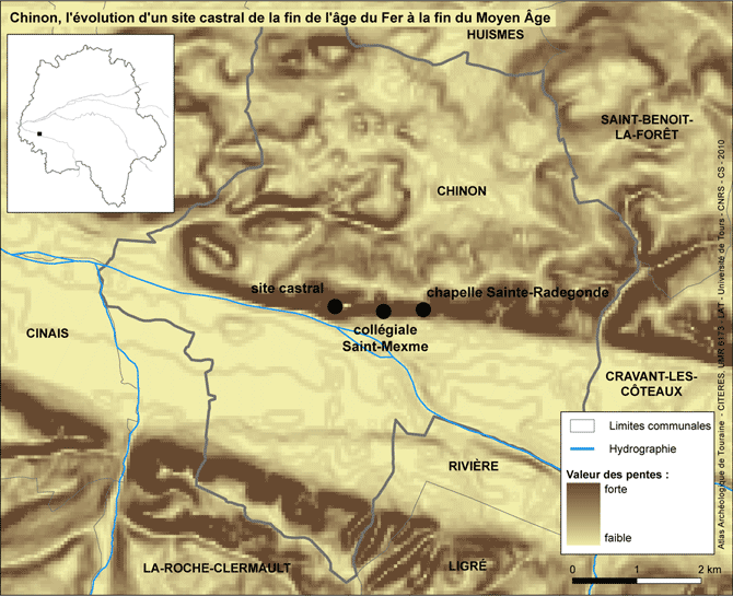 Dans l'Antiquité, Chinon devait être un bourg au bord de la Vienne. Son extension peut être évaluée grâce à la répartition des découvertes, mais aucune véritable fouille n'a encore eu lieu sur des niveaux gallo-romains à part de petits secteurs au fond de la fouille de la basilique Saint-Mexme. Dès la fin de La Tène, un habitat privilégié se dressait sur la hauteur, sans que l'on sache si le pied du coteau était alors habité. Puis, une occupation s'y développe et un rempart est construit au 5e siècle (castrum). Le cours de la Vienne était alors plus large (endigué au 19e siècle), tandis que de nombreux effondrements du coteau ont restreint la place disponible en hauteur au profit de la ville en contrebas (analyse et DAO : B. Dufaÿ)