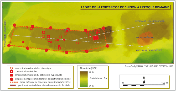 Le site de la forteresse de Chinon à l'époque romaine. Seule une petite portion du rempart du castrum est archéologiquement bien attestée. Le reste du tracé comme l'emplacement des tours sont le résultat d'indices archéologiques indirects.