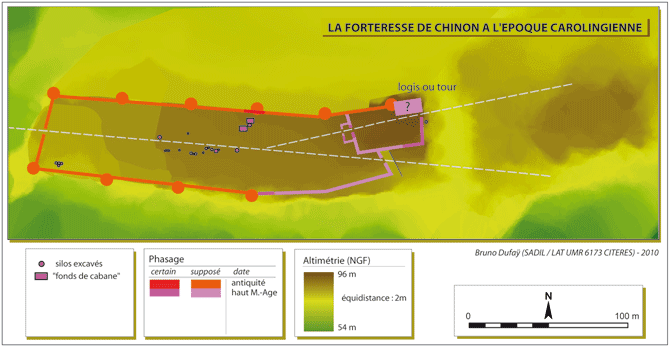 La forteresse de Chinon à l'époque carolingienne. On note qu'à l'extrémité orientale du castrum se structure un quadrilatère défensif alors que le reste de l'éperon est dévolu aux activités du domaine agricole.