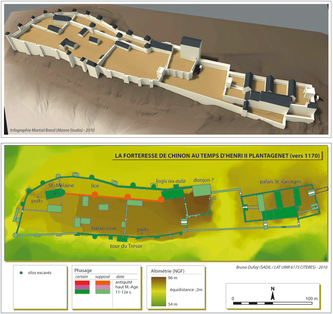 La forteresse de Chinon au début du 12e siècle. Aux 11e-12e siècles, le quadrilatère apparu à l'époque précédente est à nouveau fortifié. Sa superficie est réduite, les remparts sont rehaussés et dotés de contreforts. Il est vraisemblable qu'alors un donjon a été édifié à la place du logis comtal : bien qu'aucune trace n'en ait encore été repérée, sa présence serait normale dans un édifice de ce rang. Un prieuré avec une chapelle dédiée à Saint-Mélaine est construit au début du 11e siècle.