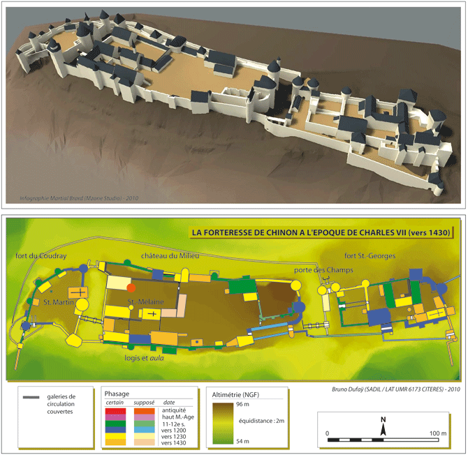 La forteresse de Chinon à l'époque de Charles VII. Aux 14e et 15e siècles, la structure générale n'est pas modifiée. La guerre de Cent Ans entraîne le rehaussement des remparts et des tours les plus importantes. La présence de la cour angevine (notamment Louis 1er d'Anjou) puis royale (Charles VII) amène la reconstruction des logis et leur amélioration progressive en matière de confort et d'ostentation.
