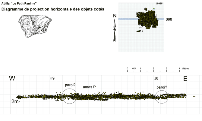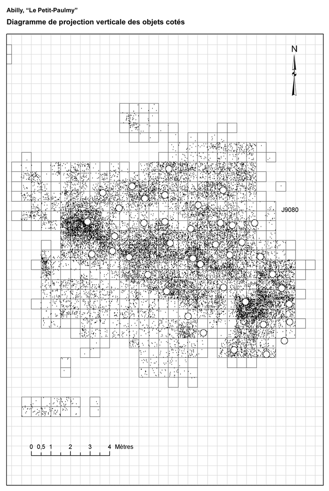 Le logiciel Arcview permet ensuite le traitement des données recueillies à la fouille pour établir des diagrammes de projections verticale et horizontale qui permettent d'apprécier la structure des nuages de points, chaque point représentant un objet. Lorsqu'on veut avoir une représentation des objets sur un plan horizontal, on utilise les coordonnées x et y de chaque objet et on effectue une projection verticale de ces objets. Lorsqu'on veut avoir une représentation des objets sur un plan vertical (qui peut être orienté soit nord/sud soit est/ouest) on utilise les coordonnées x et z de chaque objet (ou les coordonnées y et z de chaque objet) et on fait une projection horizontale de ces objets. Le logiciel Arcview permet également de faire une représentation en trois dimensions du nuage de points.