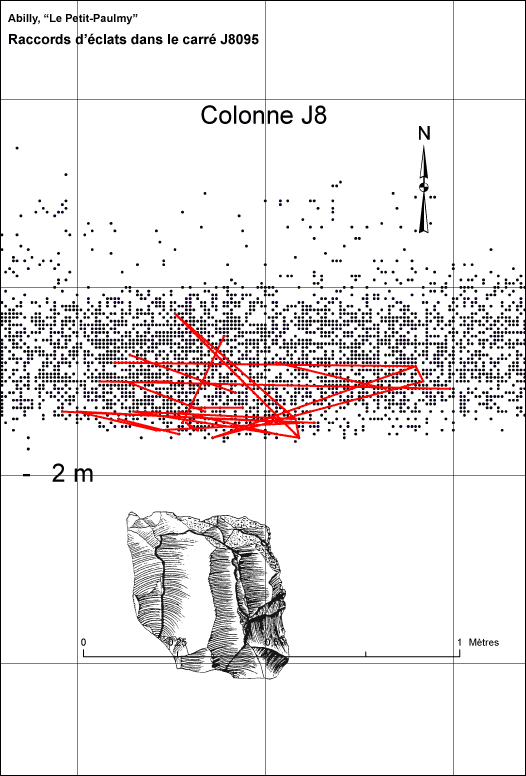 Le diagramme est un diagramme de projection horizontale ; la couche archéologique est donc vue en coupe verticale. Chaque trait relie deux objets qui se raccordent. Le fait que les raccords concernent des objets qui sont aussi bien à la base qu'au sommet de la couche montre que nous sommes très vraisemblablement en présence d'une seule couche archéologique.