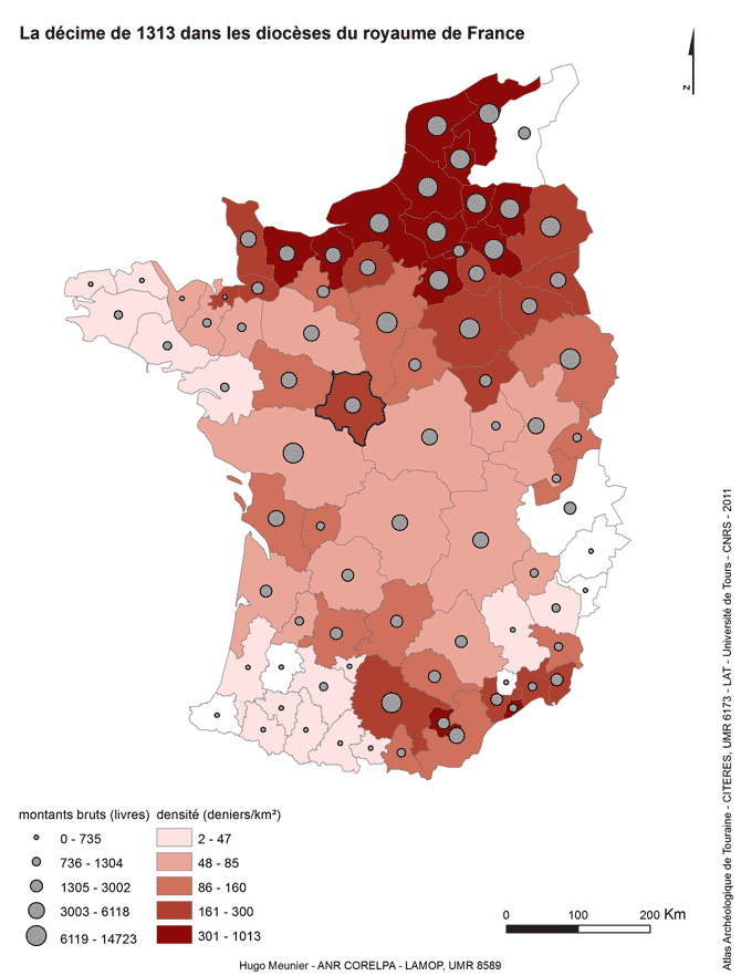 Le montant de la décime de 1313 est extrait d'un compte du début du 14e siècle qui se rapporte à la première année des 6 décimes concédées à Philippe IV le Bel lors du concile de Vienne en 1312 (CAUSSE 1988 : 201). Le total du subside pour chaque diocèse du royaume de France y est inscrit. L'archevêché de Vienne, les évêchés de Valence, Cambrai, Bayonne et Lyon contribuent à la décime uniquement pour les bénéfices situés dans les limites de la Couronne et n'ont donc pas été pris en compte pour le calcul des densités. On remarque de fortes valeurs dans le nord du royaume, dans les provinces ecclésiastiques de Rouen, Reims et Sens, ainsi que dans les diocèses de Toulouse et de la façade méditerranéenne. La Bretagne apparaît comme l'une des régions les moins taxées, avec les Landes, les Pyrénées et une grande partie de la province de Bourges.