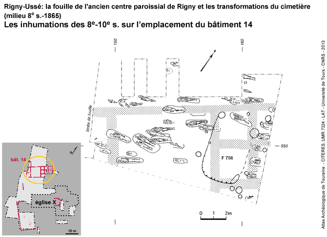 C'est à partir du milieu du 8e s. que les sépultures ont occupé progressivement les ruines des bâtiments et les espaces intermédiaires. Les sépultures ont des orientations variables et des espacements irréguliers, en dépit de la présence de quelques alignements. Leur disposition rappelle les petits ensembles funéraires mis au jour dans les habitats ruraux du haut Moyen Âge.