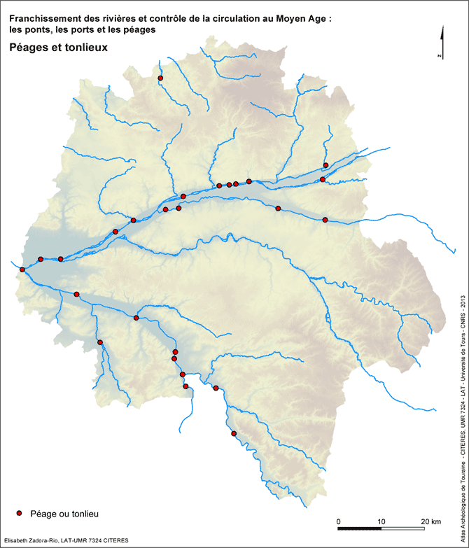 Les péages (impôts prélevés sur le passage par voie fluviale ou terrestre) et les tonlieux (impôts prélevés sur les marchandises) sont mentionnés dans les actes essentiellement à l'occasion des conflits qu'ils suscitent, ou des exemptions dont ils font l'objet. Il est rare que les sources permettent de dater l'instauration ou la disparition d'un péage ou d'un tonlieu, et les lieux de perception représentés sur la carte n'ont sans doute pas fonctionné simultanément. Leur concentration le long du cours de la Loire, de la Vienne et du Cher souligne l'intensité du trafic fluvial sur ces voies d'eau.
