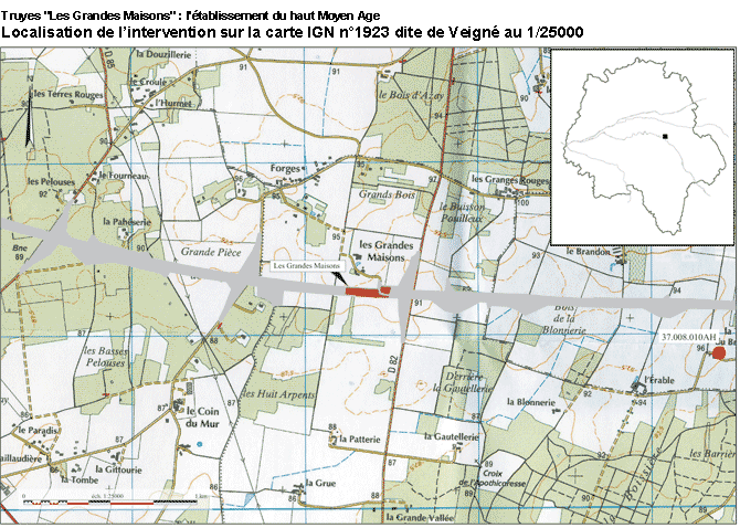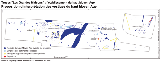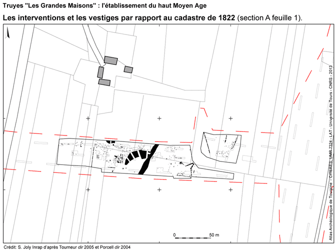 Le site des Grandes Maisons a été découvert en 2004 (PORCELL 2004) puis fouillé en 2005 sur 1,9 ha (TOURNEUR 2005) lors des travaux de l'autoroute A85. Au total environ 500 vestiges ont été repérés et fouillés lors des interventions dont près de 400 trous de poteau.