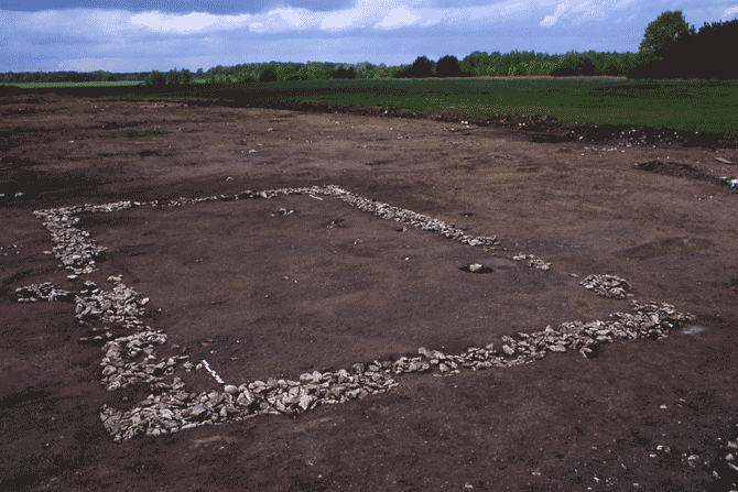 Bâtiment d'habitation sur solin de pierre. Auteur : J. Tourneur, Inrap