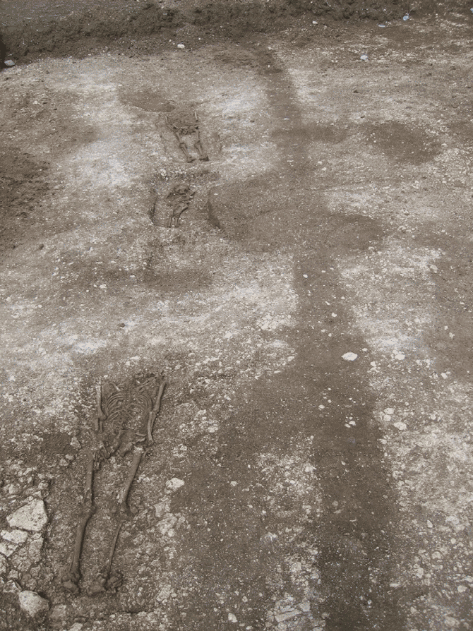 Vue générale des sépultures groupées en chapelet le long d'un fossé au nord-ouest de l'intervention. Les 5 datations par radiocarbone effectuées sont comprises entre la toute fin du 7e s., voire le 8e s. jusqu'aux 9e-10e s. au plus tard.