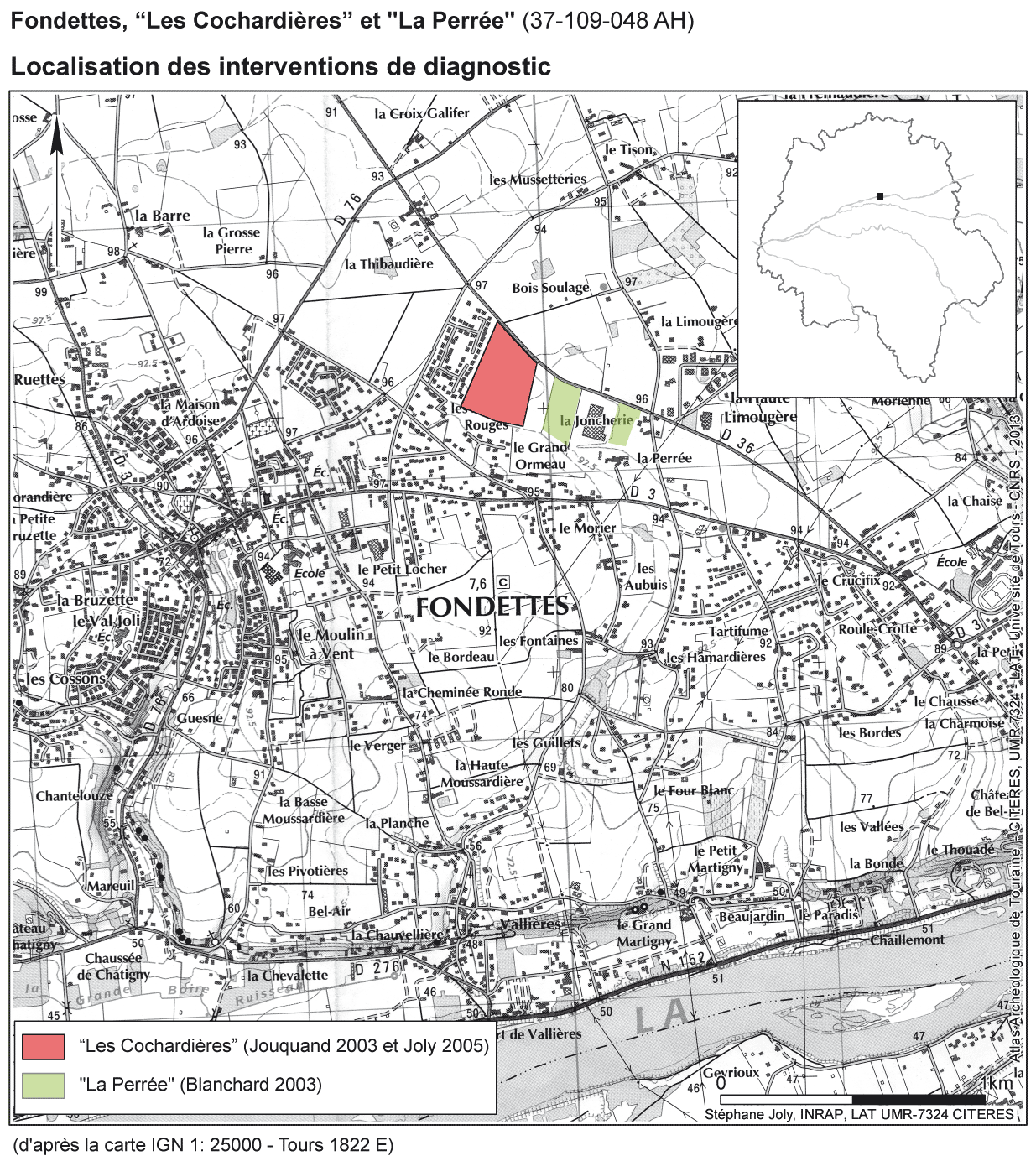 Le site des Cochardières se trouve à 2 km environ en retrait du rebord du plateau, à près de 1 km au nord-est du centre bourg de Fondettes. Le site des Cochardières se trouve à 2 km environ en retrait du rebord du plateau, à près de 1 km au nord-est du centre bourg de Fondettes.