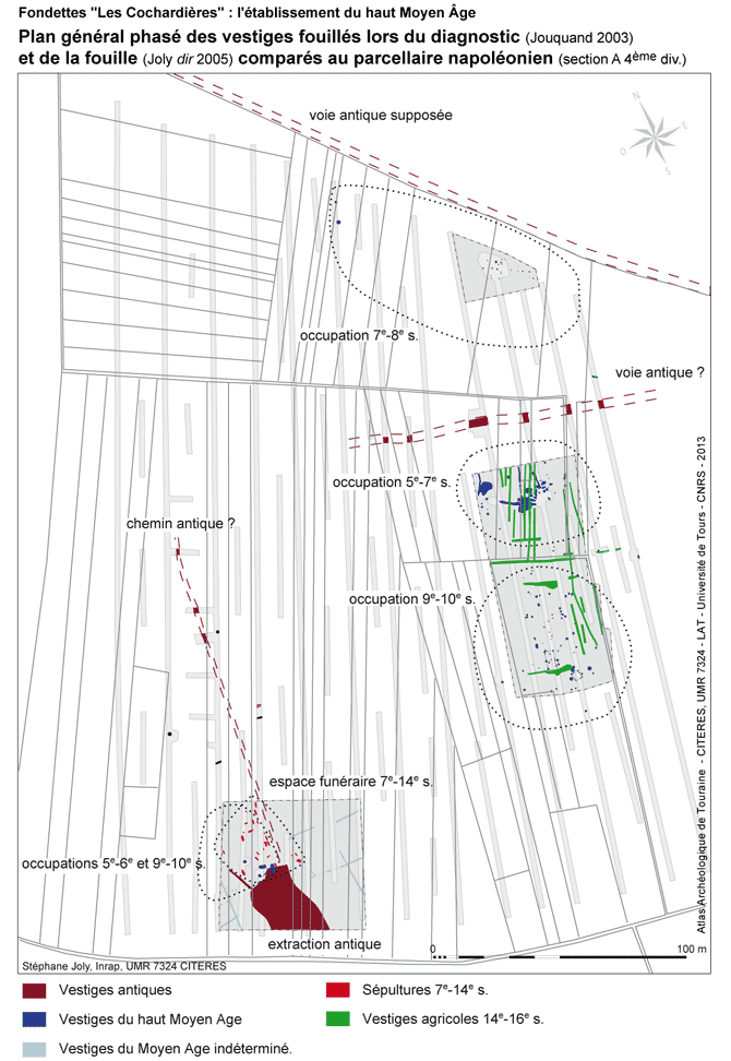 Le site des Cochardières a été découvert en 2003 lors du diagnostic d'un futur lotissement sur 6,6 ha (JOUQUAND, JESSET 2003) puis fouillé en 2004 sur 0,7 ha (JOLY dir 2005). Au total environ 250 vestiges ont été repérés et fouillés lors des interventions dont près de 200 se rattachent au haut Moyen Âge. La lecture globale des occupations est particulièrement contrainte par la réalisation d'un décapage en trois petites zones distinctes.
