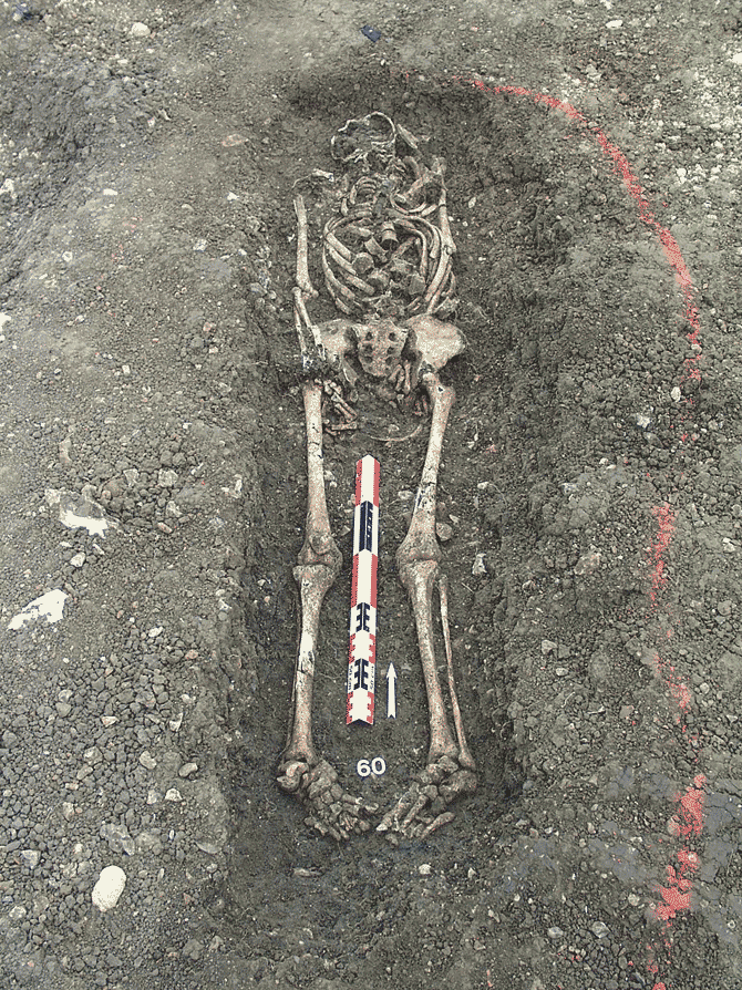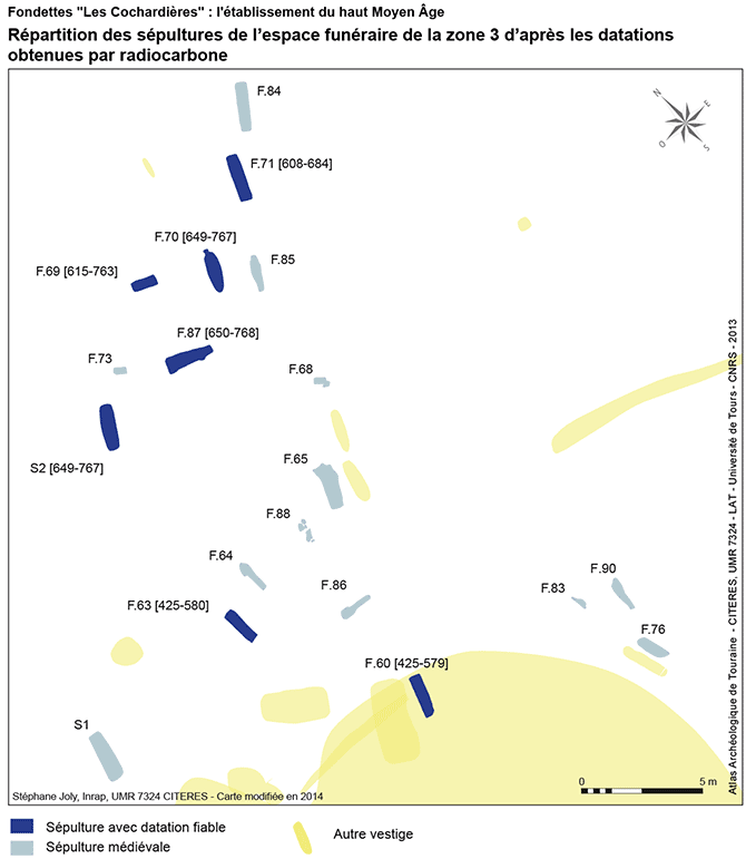 Répartition des sépultures de l'espace funéraire de la zone 3 d'après les datations fiables obtenues par radiocarbone. Une partie des sépultures s'organisent le long d'un espace "vide" correspondant sans doute à un chemin menant à l'extraction antique qui, une fois partiellement comblée, a pu servir de point bas humide.