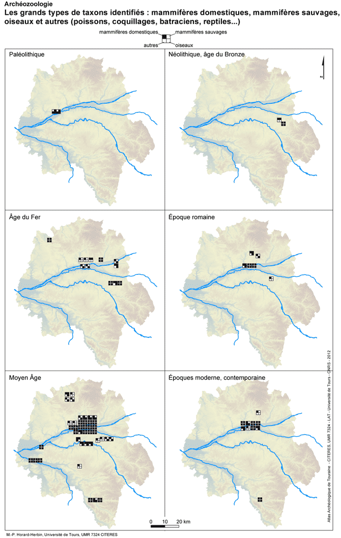 L'inventaire des grands types de taxons révèle la présence récurrente des mammifères domestiques sur l'ensemble des sites depuis le Néolithique. En revanche, l'apport de mammifères chassés est loin d'être systématique, comme celle des autres taxons (oiseaux, poissons, coquillages, batraciens, reptiles...) pour lesquels se posent parfois des problèmes de prélèvement et de détermination spécifique.