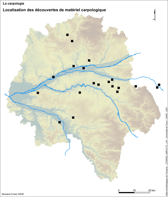Les études carpologiques en Touraine sont encore peu nombreuses puisque seulement 23 sites ont donné lieu à des analyses de macro-restes végétaux : 10 pour l'Age du Fer, 7 pour l'époque gallo-romaine, 4 pour l'époque médiévale et 2 du 16e s. Par ailleurs, la quantité de restes est variable, certains sites étant mal documentés et n'ayant livré que très peu de semences archéologiques. Ces données, trop disparates et clairsemées, ne permettent pas actuellement de faire une analyse spatiale de la répartition des espèces. Ainsi, la cartographie ne représente-t-elle que l'emplacement des sites ayant livré du matériel carpologique, par grande phases chronologiques.