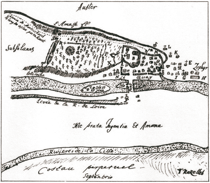 Carte de Siette. (Siette R. 1649- Vue cavalière d'Amboise, conservée à la BNF, cote Ge DD 2937 (1192) ; copie dans le fonds ancien de la Bibliothèque municipale de Tours (cote CPa 208)).