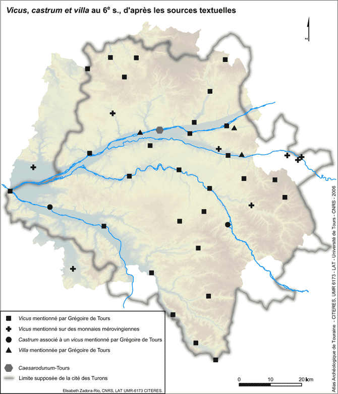 Grégoire de Tours mentionne 31 vici en Touraine au 6e s., et seulement 3 villae et 2 castra.Ce fait ne reflète pas la fréquence relative des villae, des castra et des vici, mais les intérêts de Grégoire. Les inscriptions sur les monnaies mérovingiennes des 6e-7e s. permettent d'identifier 8 vici supplémentaires, ce qui porte à 39 le total des vici connus.