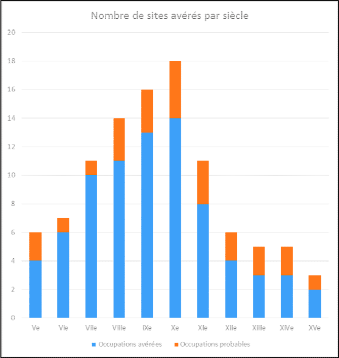 Les datations des sites étudiés révèlent une plus forte représentation de certaines périodes. Le spectre chronologique rappelle celui du Nord de la France. Les sites des derniers siècles du haut Moyen Âge (notamment les 9e-10e siècles) sont les plus nombreux. De nombreuses opérations ont mis au jour également des occupations plus tardives : le 12e siècle est ainsi aussi bien représenté que le 5e s. et les 13e et 14 siècles comptent chacun une demi-dizaine de sites.